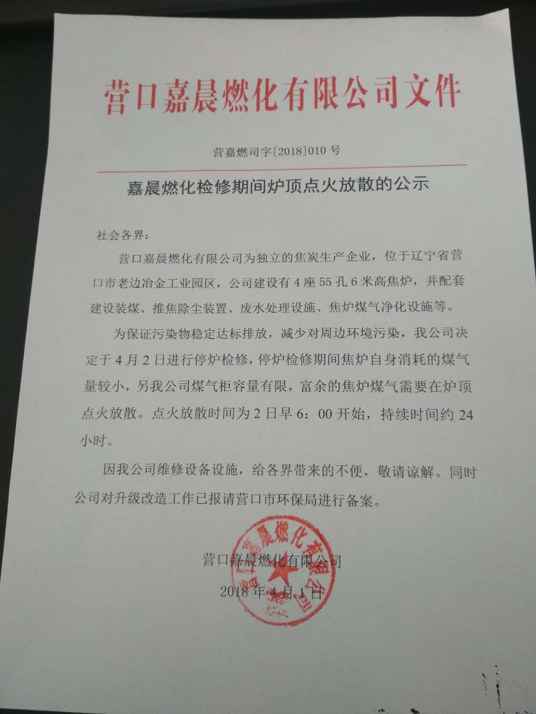 營口嘉晨燃化檢修期間爐頂點(diǎn)火放散的公示