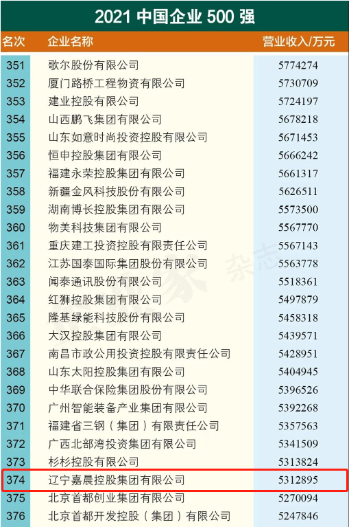 9月25日,以“新征程 新使命 新作為:全力推進大企業(yè)高質(zhì)量發(fā)展”為主題的2021中國500強企業(yè)高峰論壇在中國長春市舉行。中國企業(yè)聯(lián)合會、中國企業(yè)家協(xié)會向社會發(fā)布“中國企業(yè)500強”名單,遼寧嘉晨控股集團榜單排名374位。