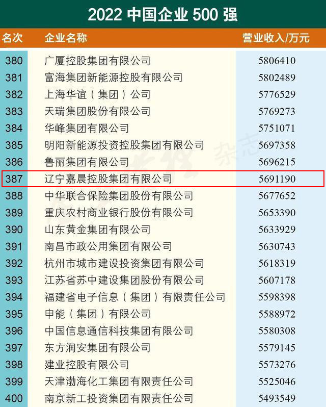 9月6日,中國(guó)企業(yè)聯(lián)合會(huì),中國(guó)企業(yè)家協(xié)會(huì)在京發(fā)布了“2022中國(guó)企業(yè)500強(qiáng)”榜單,遼寧嘉晨控股集團(tuán)榜單排名387位。今年是“中國(guó)企業(yè)500強(qiáng)”榜單自發(fā)布以來(lái)入圍門檻絕對(duì)值提高最多的一年。